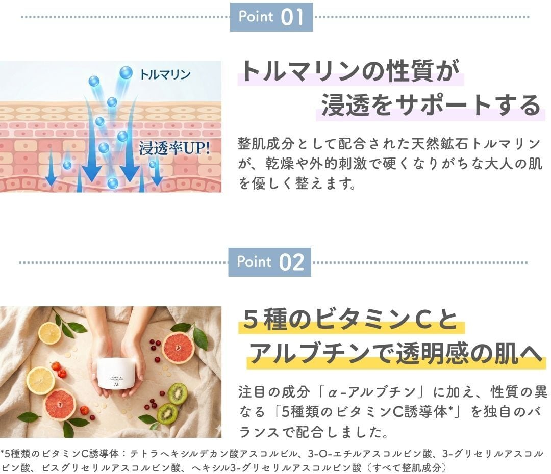 普段お使いのスキンケアを、トルマリンの力を活かしながら心地よくなじませ、角質層まで届けるようサポートします。 《ASVIAS IONISTA PURELY WHITE GEL》アスビアス イオニスタ 【全成分】 水、BG、プロパンジオール、スクラン、ソルビトール、グリセリン、オリーブ果実油、トルマリン、プラセンタエキス、加水分解コラーゲン、ヒアルロン酸Na、水溶性プロテオグリカン、a-アルプチン、テトラヘキシルデカン酸アスコルピル、3-0-エチルアスコルピン酸、3-グリセリルアスコルピン酸、ビスグリセリルアスコルピン酸、ヘキシル3-プリセリルアスコルビン酸、アラントイン、ホホバ種子油、トコフェロール、ダイマージリノール酸ダイマージリノレイル、トリ(カプリル酸/カプリン酸)グリセリル、ジフェニルシロキシフェニルトリメチコン、(C13,14)イソパラフィン、ラウレス-7、ポリアクリルアミド、カルボマー、水酸化K、ベルガモット果実油、ニオイテンジクアオイ油、フェノキシエタノール 【美容成分一覧】 プラセンタエキス、加水分解コラーゲン、ヒアルロン酸Na、水溶性プロテオグリカン、a-アルプチン、テトラヘキシルデカン酸アスコルピル、3-0-エチルアスコルピン酸、3-グリセリルアスコルピン酸、ビスグリセリルアスコルピン酸、ヘキシル3-プリセリルアスコルビン酸、アラントイン 【内容量】 50g 【ご使用方法】 付属のスパチュラで適量を手にとりお肌になじませてください。使用後のスパチュラはティッシュなどでよく拭いてください。 【使用上の注意】 ●お別に異常が生じていないかよく注意して使用してください。化粧品がお別に合わないとき即ち次のような場合には、使用を中止してください。そのまま化粧品類の使用を続けますと、症状を悪化させることがありますので、皮膚科専門医等にご相談されることをおすすめします。 (1)使用中、赤味、はれ、かゆみ、刺説、色抜け(白等)や黒ずみ等の異常があらわれた場合 (2)使用したお別に、直射日光があたって上記のような異常があらわれた場合 ●傷やはれもの、しっしん等、異常のある部位にはお使いにならないでください。 ●目に入らないようにご注意ください。 【保管及び取り扱い上の注意】 ●使用後は必ずしっかり蓋をしめてください。 ●化粧品の中身を出し過ぎても戻さないでください。 ●付属のスパチュラを使用し、清潔な手指で化粧品をお使いください。 ●乳幼児の手の届かないところに保管してください。 ●極端に高温または低温の場所、直射日光のあたる場所には保管しないでください。 ●保管状況により着色や粘度、におい等に変化が生じる場合がありますが、品質には間題ございません。